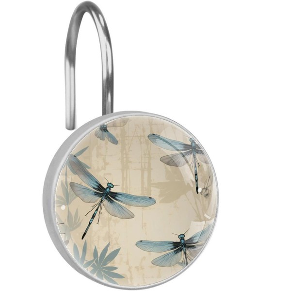 FVQL 12 Pieces Shower Curtain Hooks Shower Rings for Curtain for Bathroom, Vintage Pattern Dragonflies