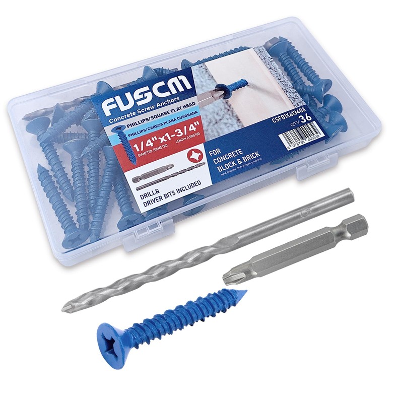FVSCM 1/4" x 1-3/4" Concrete Screw Anchor,Phillips/Square Flat Head, Drill & Driver Bits Included, for Concrete, Block & Brick(36pcs/Box)