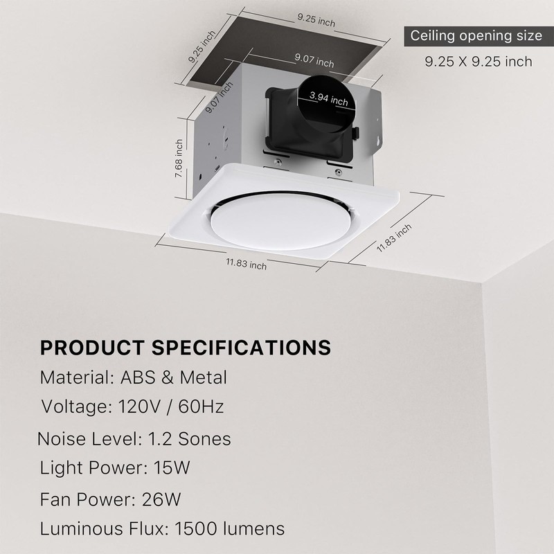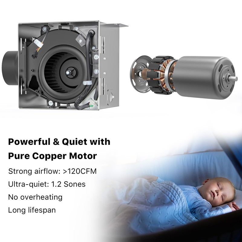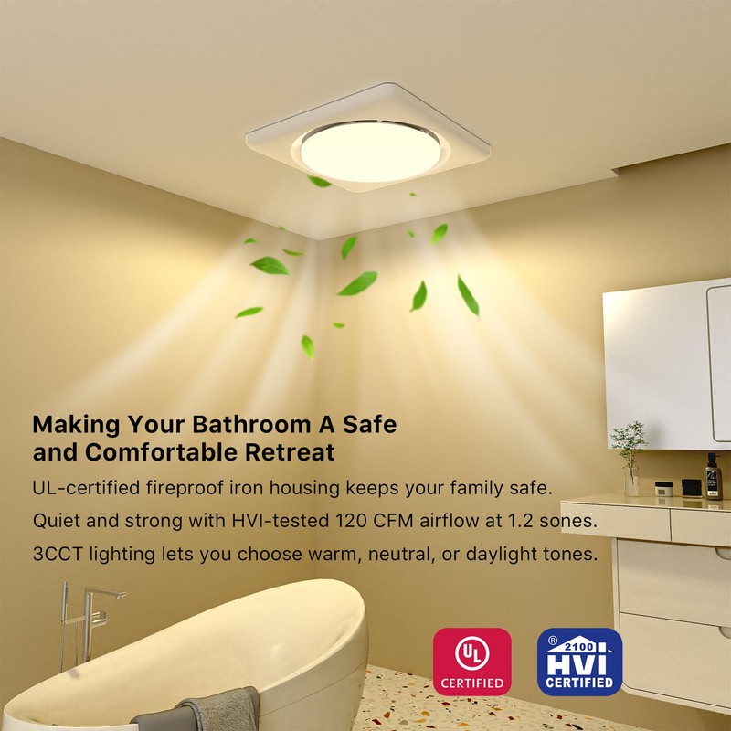 - 2-in-1 BATHROOM FAN WITH LIGHT: experience the perfect balance of power and peace with this bathroom exhaust fan light. operating at a whisper-quiet 1.2 sones, it swiftly clears moisture and humidity with a strong 120 CFM fan, promoting cleaner air and preventing mold. the integrated 15W LED delivers a brilliant 1500 lumens equivalent to a 150W incandescent, brightening every inch of your space. designed for both performance and comfort, this bathroom fan with light is your essential upgrade for a healthier and brighter bathroom.