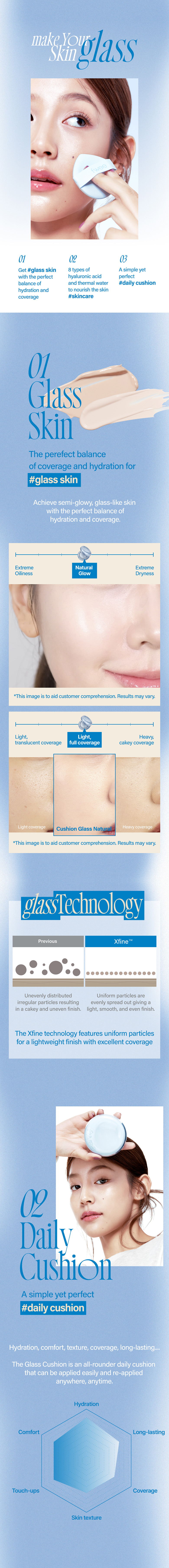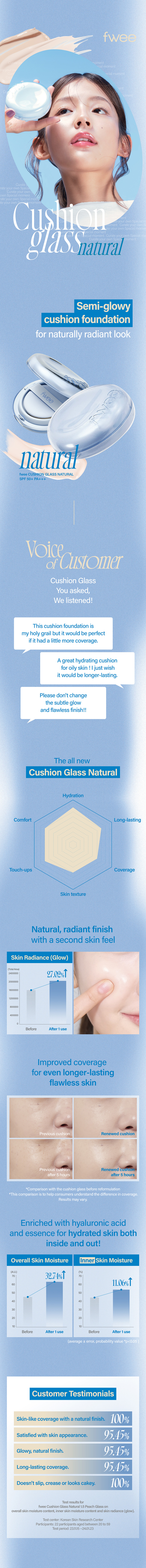 The semi-glow cushion that has become thinner and cleaner. The transparent expression and clear inner glow remain the same as my skin. It provides clean coverage that piles up and long-lasting durability that does not crumble. It shows 100% seamless and neat glow and 95% satisfaction in transparency, seamless expression, skin expression, and durability by 95%. It provides a semi-glow expression that gently shines with the golden balance of moisture and coverage. It is a daily cushion that can be easily applied while satisfying various specifications.