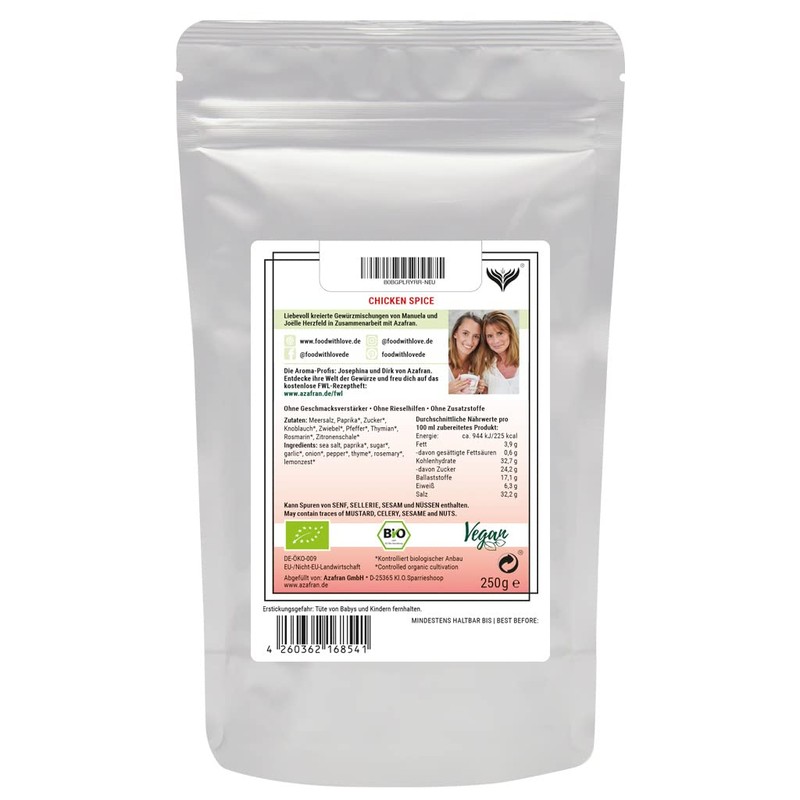 - Our chicken spice is a typical German spice preparation made from high-quality organic ingredients, which we have developed together with Manuela and Joëlle from Food with Love.
