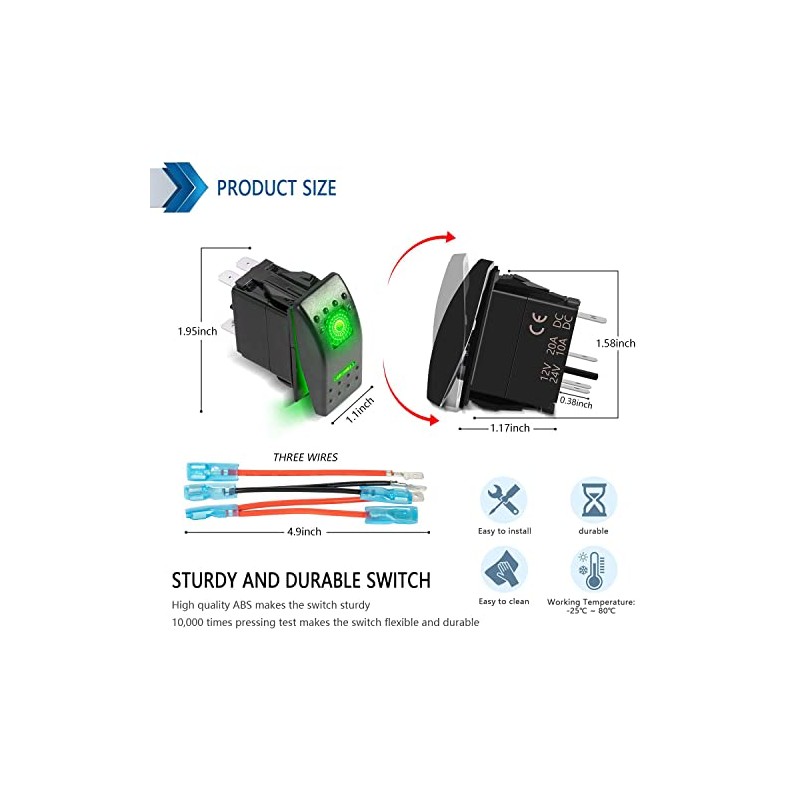 - Wide ApplicationStandard 5 Pin switch, rated at DC 12V/20Amp and DC 24V/10Amp, Fits for most car, SUV, ATV, UTV, 4X4, motorcycle, truck, Jeep, Wrangler, boat, yacht and other off-road vehicles.