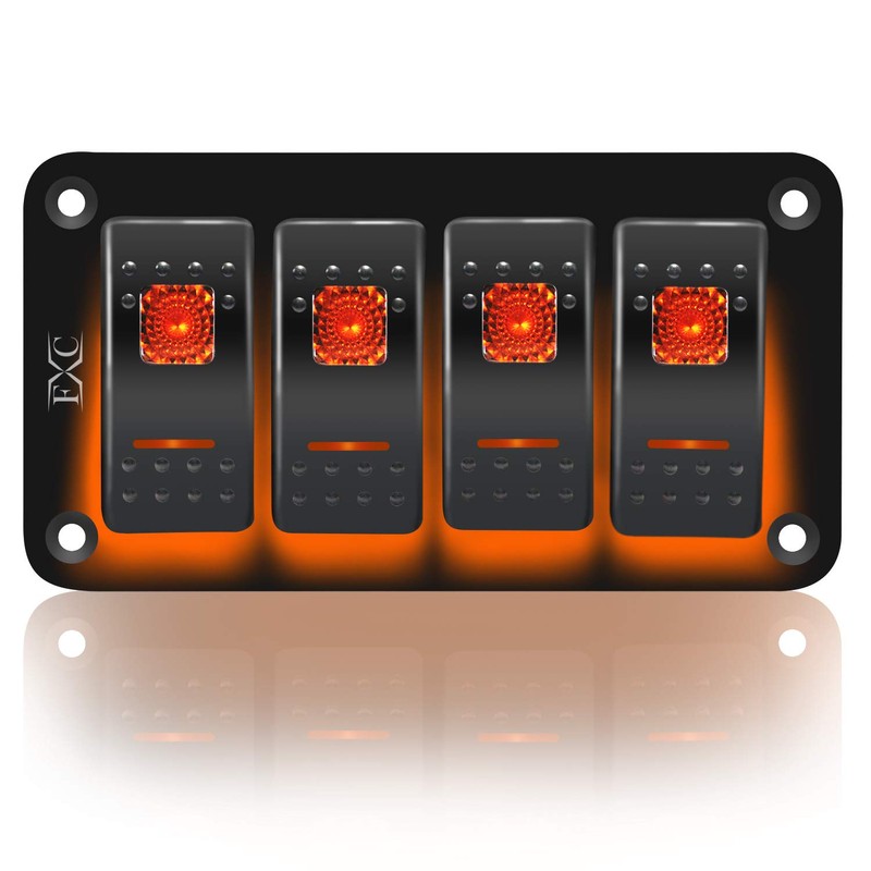 FXC Rocker Switch Aluminum Panel 4 Gang Toggle Switches Dash 5 Pin ON/Off 2 LED Backlit for Boat Car Marine