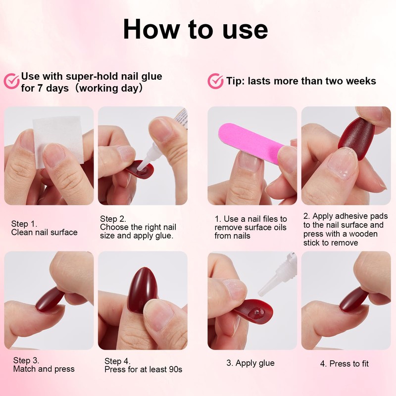 - 【Reusable】You can attach fake nails in just a few minutes and wear them for several days to a week or more at a time! If you want them to last longer, we recommend using nail glue and double-sided nail adhesive sheets together. If you want to change the design every week, it is best to use glue only. Double-sided nail adhesive tabs are ideal for short dates or small events.