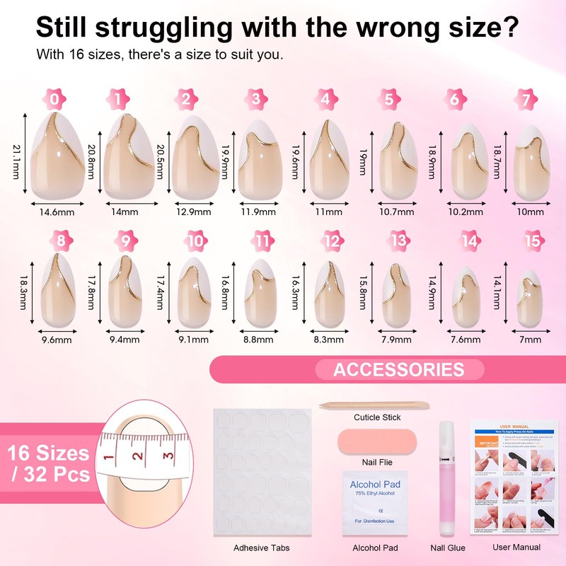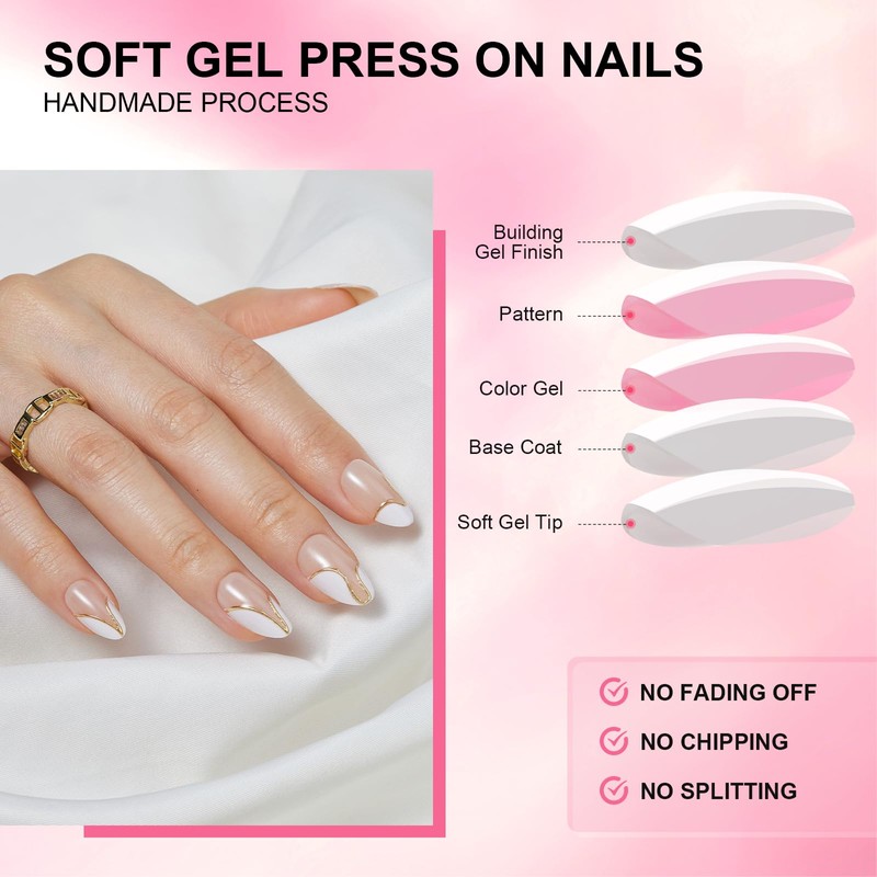- FITS THE NAIL BED - Press-on false nails are made of soft gel that is soft and flexible, putting zero pressure on the nail bed and feeling like real nails, and the favourite almond shape ensures that your nails look seamless and fit nicely on the nail bed.