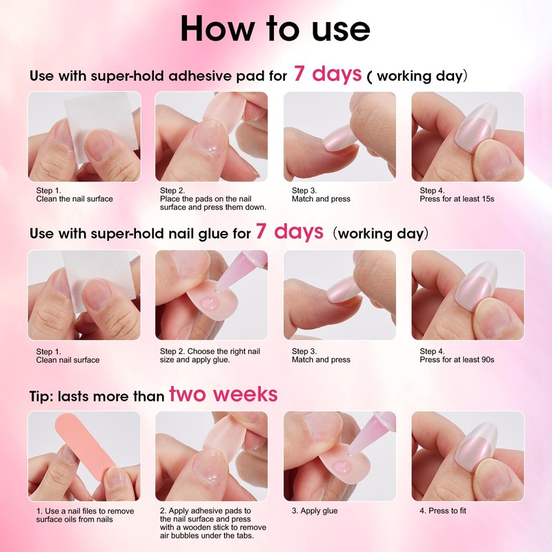- REUSABLE - You can wear the press-on false nails in just a few minutes, and you can wear them for a few days or weeks at a time! Usually wearable for up to 2 weeks . If you want more than 14 days of longevity, we recommend using both nail glue and double sided nail adhesive sheets. If you want to change the design weekly, it's best to use only glue. Double sided nail bonding tabs are perfect for short date nights or small events.