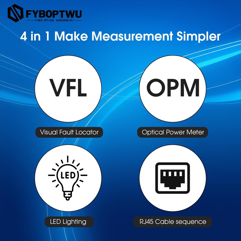 • 【4 in 1 Function】 Optical power meter & 5mw Visual Fault Locator (VFL) & RJ45 Network test & LED Lighting. 1100mAh rechargeable lithium battery.