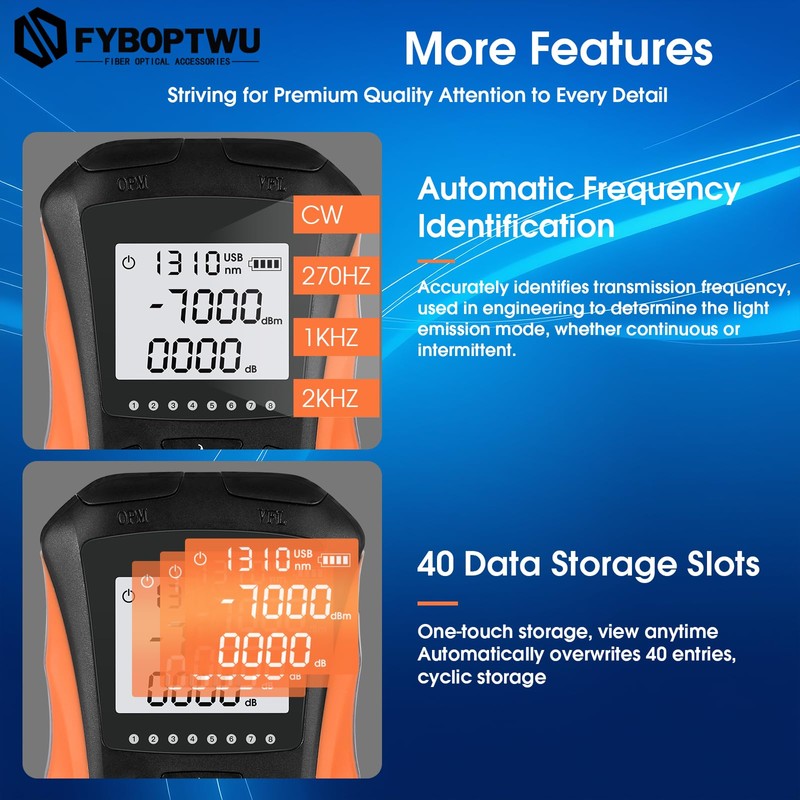 • 【Advantages】Support lighting,Support automatic shutdown,Support backlight selection, Support wavelenghth memory function,Support user calibration. Support FC/SC/ST universal interface,Support RJ45 testing (Seeking distance 200m) , Support simultaneous disply of linear mW (0.1%) and non-linear index dBm (0.01).