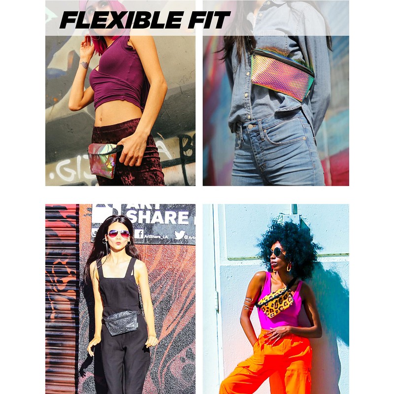 - Compact, Lightweight, and Adjustable: Fydelity Holographic fanny backpack for women are lightweight, durable, and compact (9" x 5.5" x 1"), designed for a sleek, low-profile look with fashion-forward styles. The adjustable belt (28" to 44") offers a perfect fit, with an optional 12" extender available, all backed by a 100% satisfaction guarantee.
