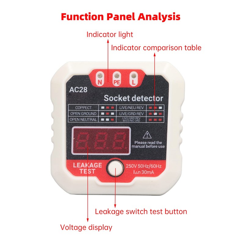 - LCD DIGITAL DISPLAY Our socket tester has LCD digital display, the voltage is easy to read, too high or too low voltage will affect the life of the device, the usual safety voltage is 198-242V.