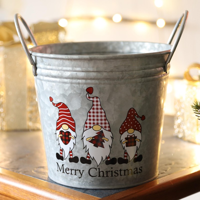 Fyne-Finds Merry Christmas Tin Pail Gnome Gonk 18cm, 7inch Plant Pot Handles 2.6L Festive Planter Decor Xmas Gift (2)