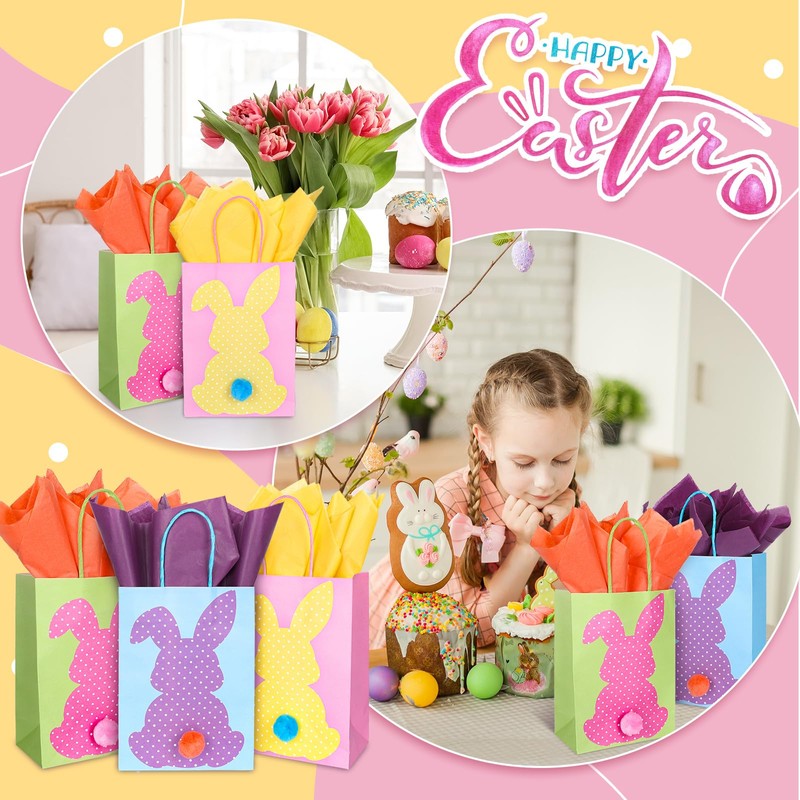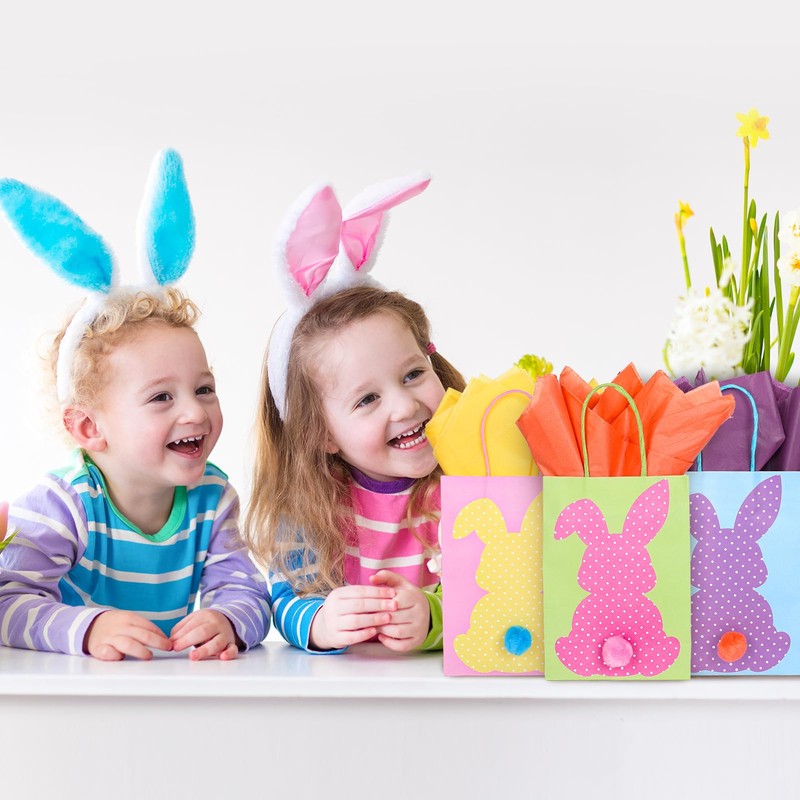 FYSUIMU 24 Set Easter Bunny Paper Treat Bags with Tissue Paper and Pompoms Colorful Rabbit Goodie Gift Bags with Handles for Spring Party DIY Craft Supplies