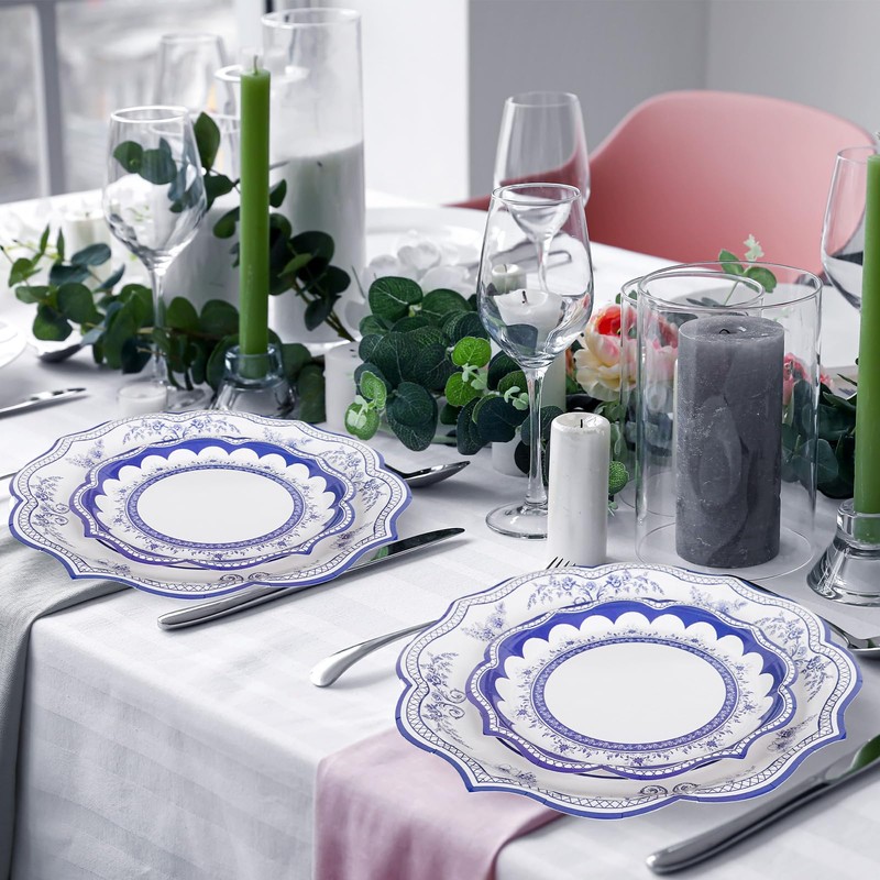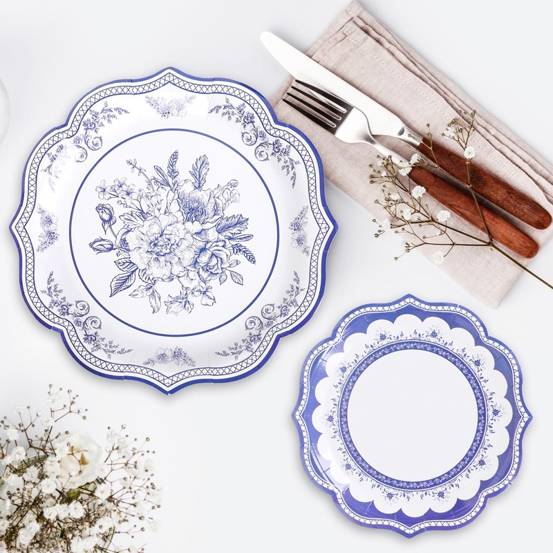 Our paper plates are designed with various chinoiserie flowers and scalloped rims, colored in blue and white, elegant and characteristic.