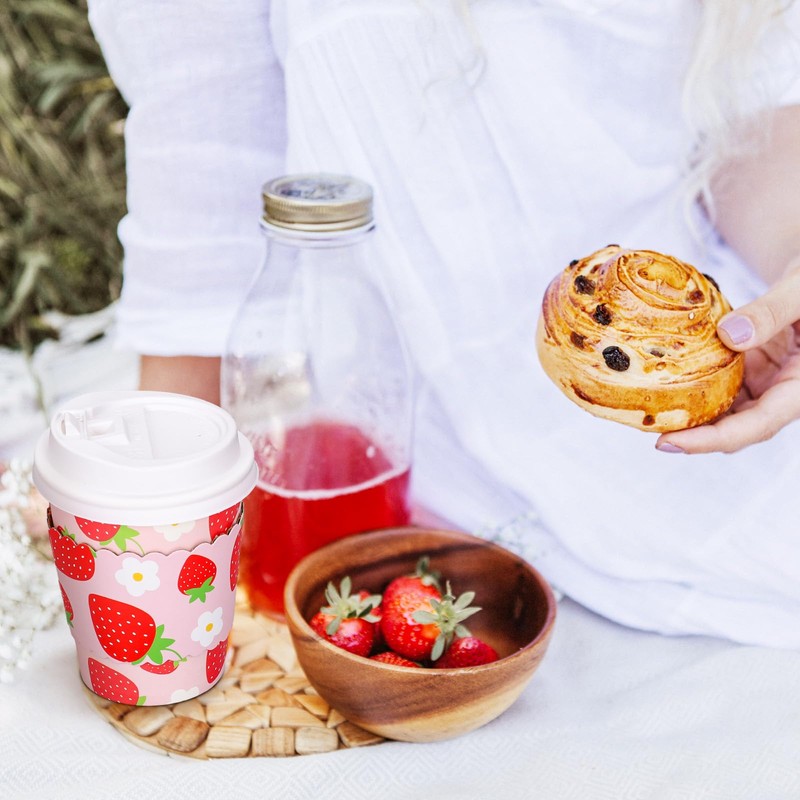 - CHIC DESIGN: Our coffee cups feature with red strawberry and white daisy, against the light pink background, and have corresponding lids and sleeves, chic and fashionable, ideal to use for daily and party time