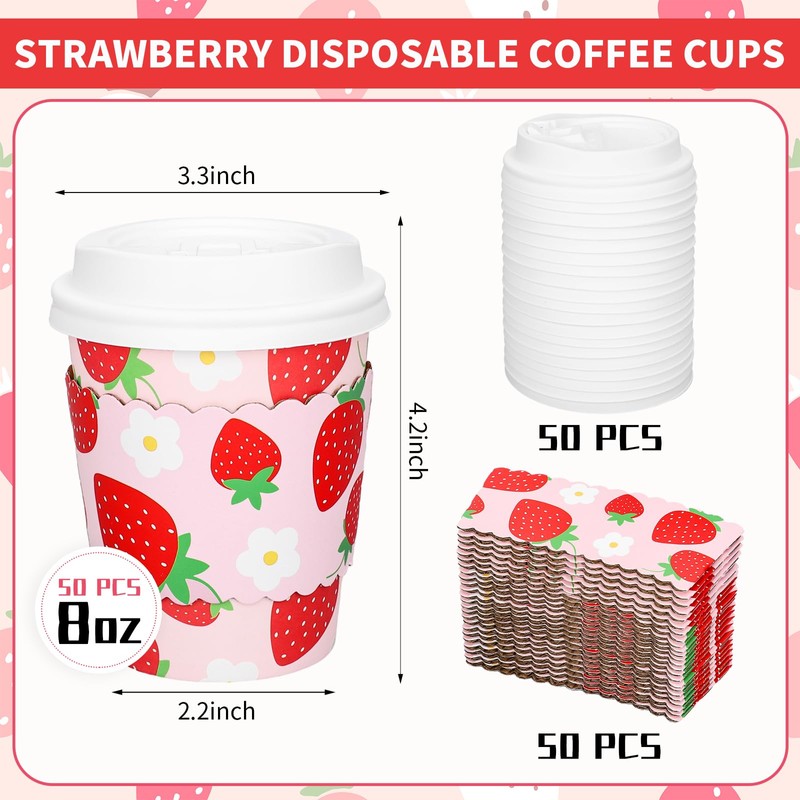 FYSUIMU 50Pcs 8Oz Strawberry Disposable Coffee Cups with Lids and Sleeves Red Pink Strawberry Beverage Paper Drinking Cups for Sweet One First Birthday Summer Fruit Party