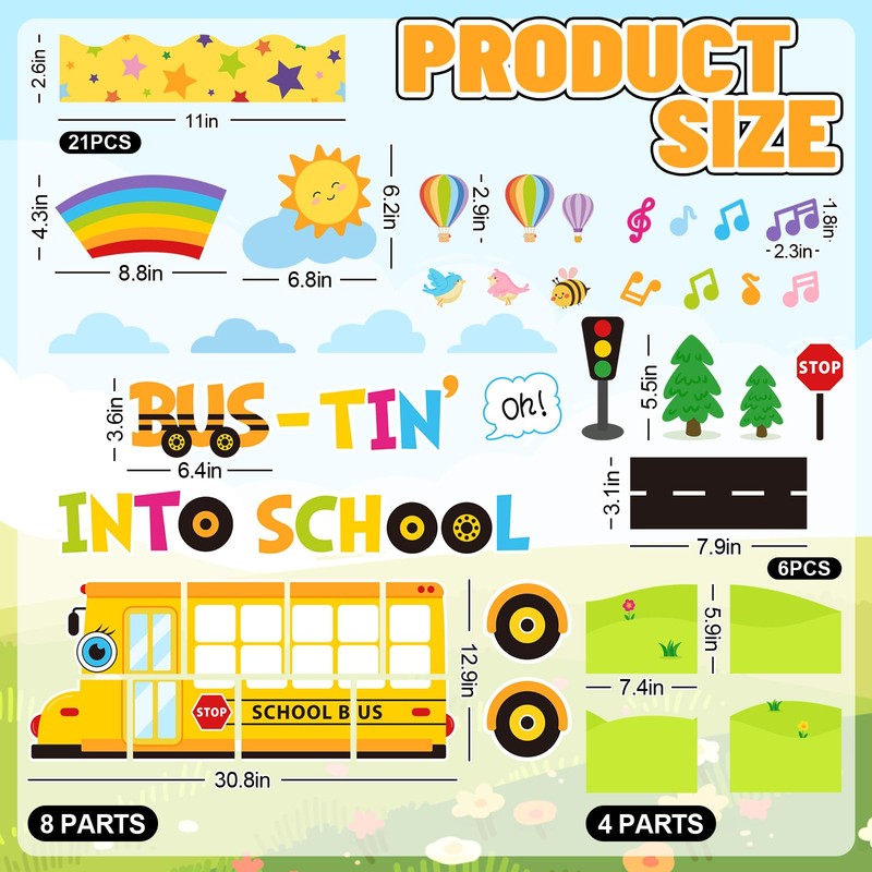 - CARTOON STYLES: Our back to school theme bulletin board cutouts are designed with school bus and the words of ‘BUS-TIN INTO SCHOOL’, decorated with various cartoon elements, and you can stick your photos on them, vivid and delicate