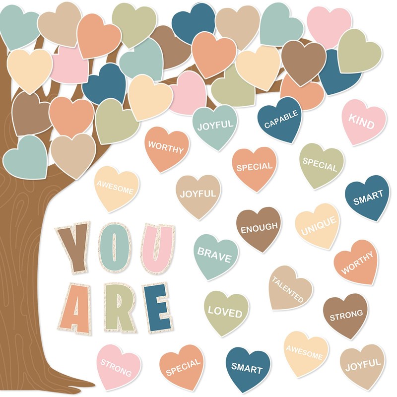 - BOHO HEART TREE: Our decoration kit takes boho heart tree as the theme, patterned with a variety of colorful heart cutouts with positive sayings, creating a warm and romantic learning environment for your kids or students