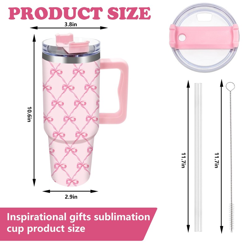 FYSUIMU Pink Bow Tumbler with Handle Straw and Lid 40oz Pink Ribbon Bow Stainless Steel Cup Travel Coffee Tumbler Cup for Home Office Holiday Birthday