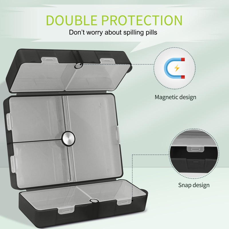 - ⏰Large Pill Box: [Foldable & Magnetic Design] The magnetic design and the inner lids are combined to form a DOUBLE LOCK,prevents the pills from falling out. The pillbox closes tightly, no worry that the case will open in your purse.