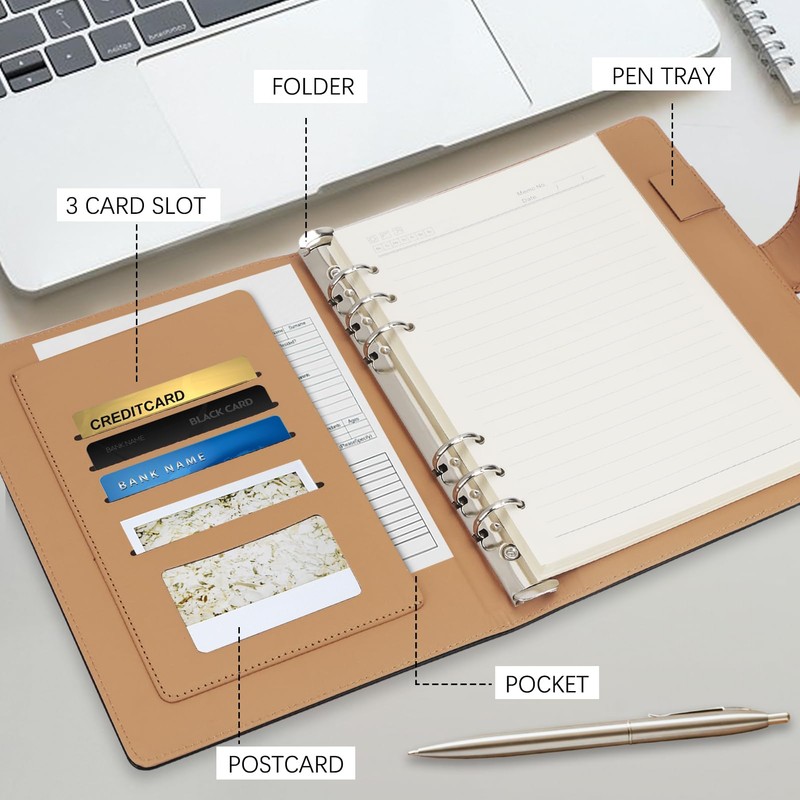 - đăQuality MaterialăThe PU leather A5 ring binder is wear-resistant and comfortable to handle, making it a good assistant for your office. The card slots and pockets inside can organize your cards, tickets, cash, etc. The pen holder can keep the pen in place.