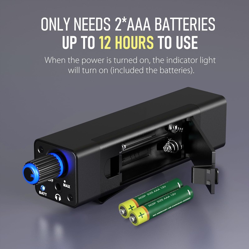 - P only needs two AAA batteries (included) to run for hours. It also has battery control and LED indicator to let you know the battery status at any time. It also comes with a . mm (/inch) stereo output jack that fits your favorite headphones and earplugs