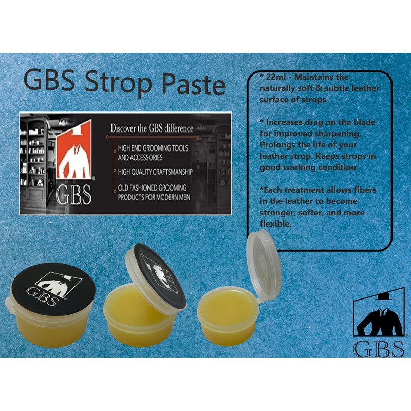 G.B.S Leather Strop Paste balm Works great on keeping strops very soft and flexible. Also helps the stropping compound to adhere to the stopping surface. Our leather strop Paste is an excellent addition to your straight razor Strop. It is made with high-quality wax.