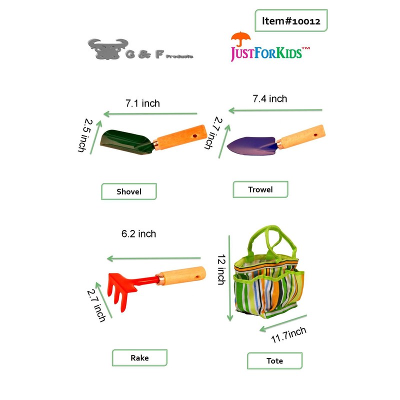 G & F 10012 JustForKids Kids Garden Tools Set with Tote hand rake shovel trowel,Assorted