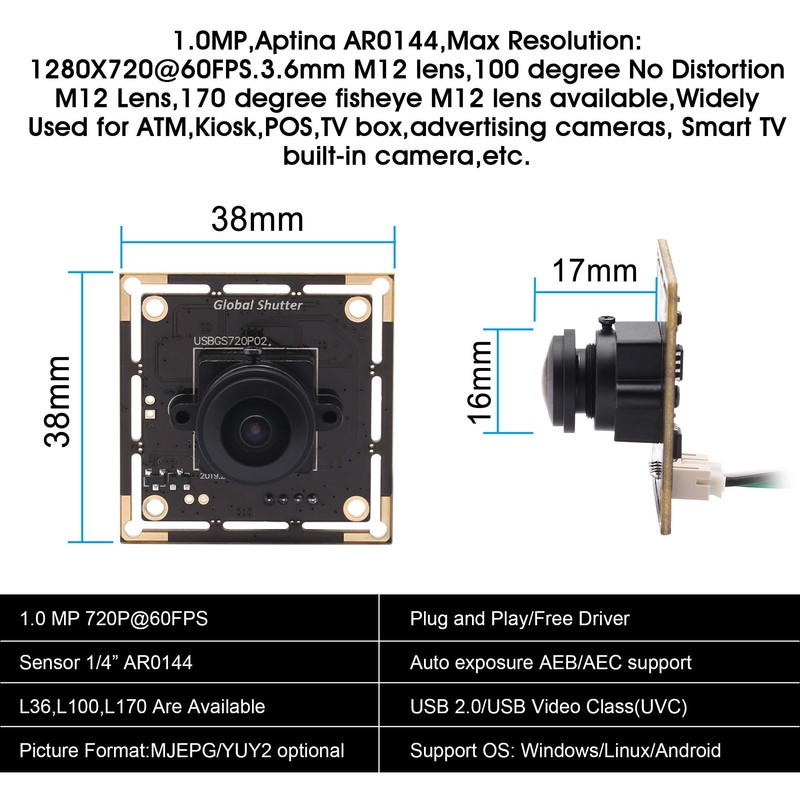 - 【1MP Global Shutter Monochrome USB Webcam:】High Speed 60fps@1280 x 720p USB Camera Module with 170degree fisheye M12 lens,100 degree Non Distortion M12 Lens optional.Support 1280X720MJPEG@ 60fps,800X600MJPEG@ 60fps,640X480 MJPEG@ 60fps.1MP USB webcam mini camera great fit for video streaming.