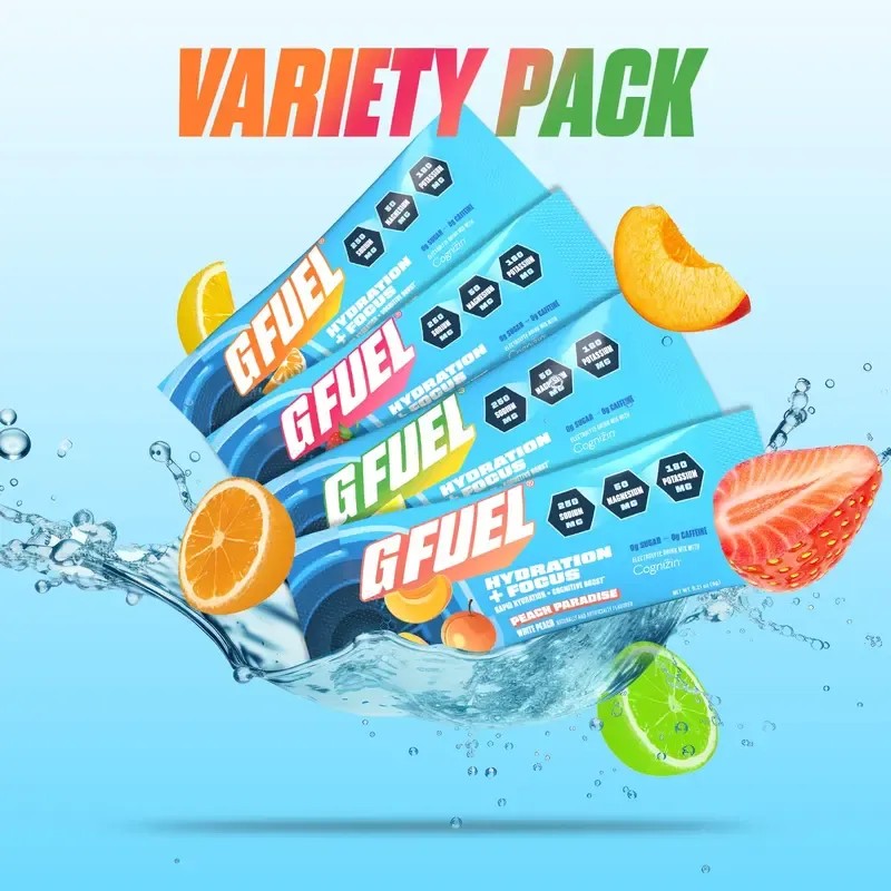 Need to hydrate fast? Meet G FUEL Hydration + Focus, our essential hydration powder that mixes revitalizing electrolytes and brain-boosting Cognizin® to get you refreshed, refocused and back in the game. Our variety pack of four fantastic sugar free flavors – Orange Oasis, Strawberry Splash, Lemon Limelight and Peach Paradise – contains 20 portable stick packets that support an on-the-go lifestyle. Formulated for players, balanced to meet everyday hydration needs and packed with fruit flavor, you’ve never tasted a drink mix quite like this one!