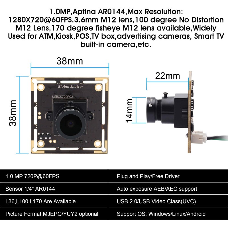 - High-speed USB 2.0 interface camera module: high-quality Aptina AR0144 sensor for high-quality images, OTG support, free driver, plug and play. Equipped with 1 metre USB cable. Closure type: Global Shutter,Monochrome, Black and White.