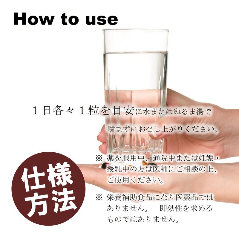 - 1日1粒を目安に水またはぬるま湯で噛まずにお召し上がりください(ご使用中、体調のすぐれないときは使用を中止してください)。