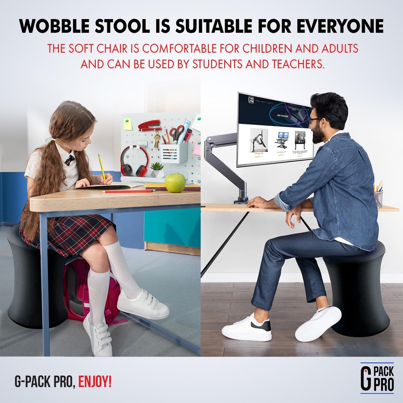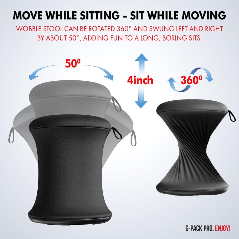 - Stay Active While Seated - G-Pack Pro's Wobble Stool can be rotated 360° and swung left and right by about 50°. Engage your core effortlessly while seated with this dynamic wobble stool. Crafted for ergonomic support, this stool encourages activation of core muscles, enhancing posture and promoting focus.