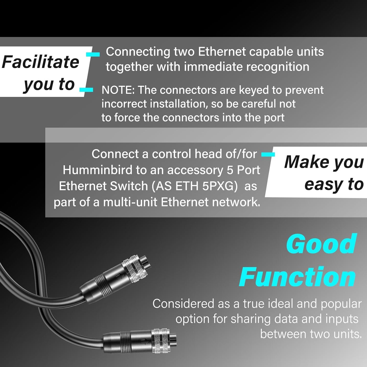 2. Ethernet Devices Connection: This 10-feet Ethernet cable is designed for seamless connectivity between two Ethernet-enabled devices or to link your Humminbird control head to an accessory 5-port Ethernet switch (AS ETH 5PXG) within a multi-device Ethernet network. It's an essential component for expanding your marine electronics setup, ensuring reliable communication across your devices.