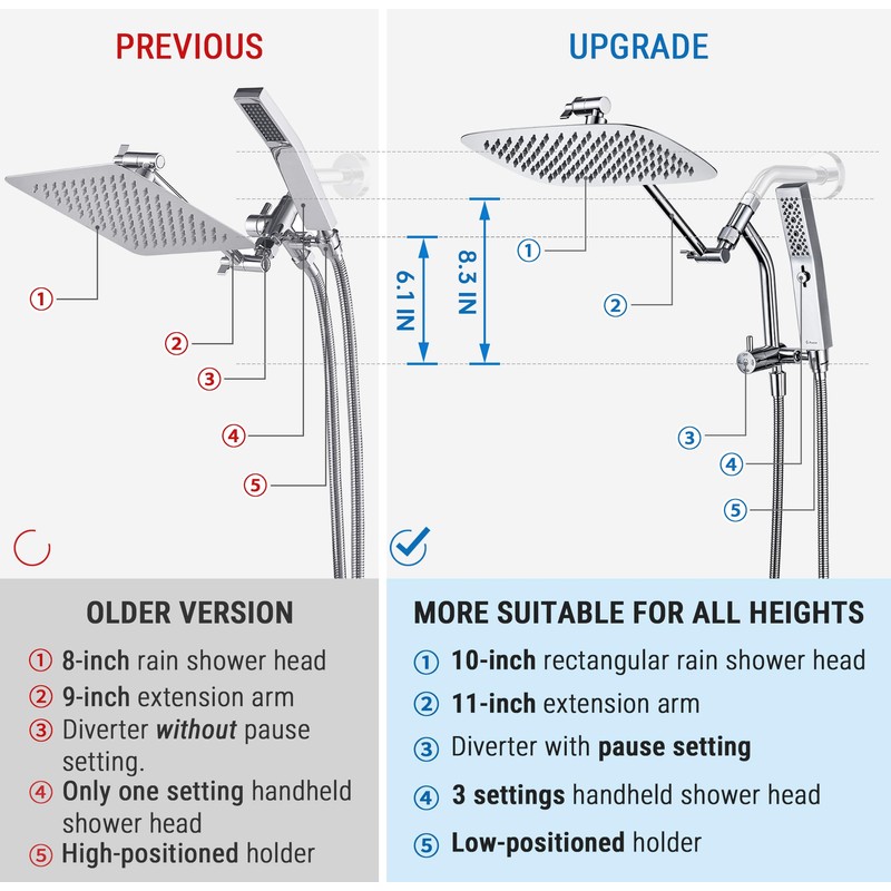 You can switch between the hand shower head and the rain shower head, or switch them both on at the same time. Add an 11-inch adjustable extender. Keep the shower head away from the wall, so that you won’t bump into the wall when taking a shower.
