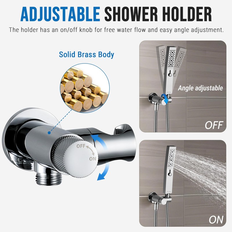 - UNIQUE HANDHELD SHOWER HOLDER WITH SWITCH: The holder comes with an on/off button through which you can individually turn the handheld shower on or off. It is convenient for you to pause the hand shower to save the water flow when applying shampoo. The holder also allows you to adjust the angle of the handheld shower according to your needs, providing you with a variety of bathing feelings