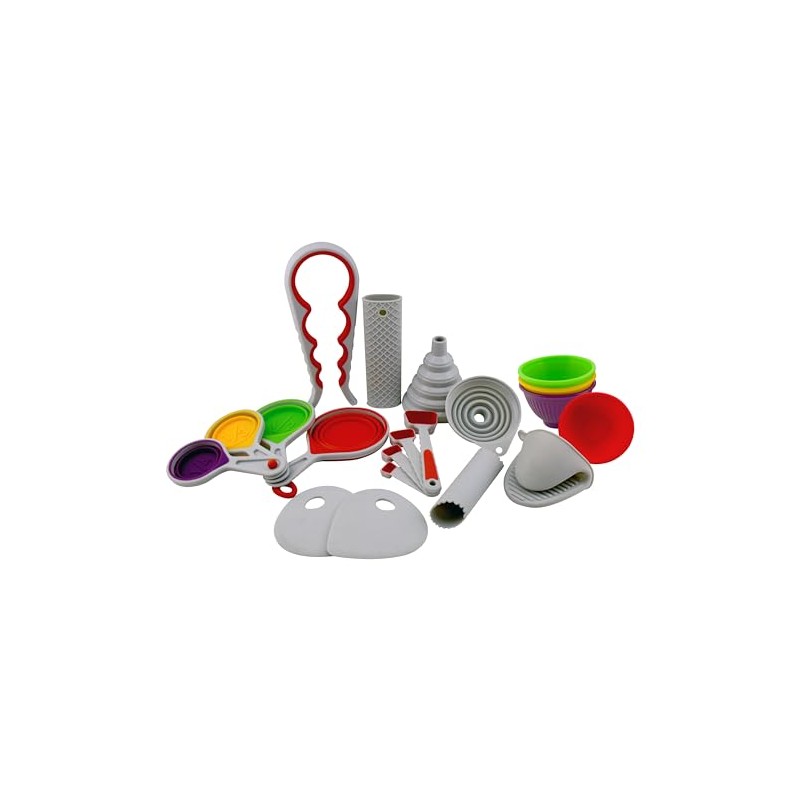 - G&S Design 20-Piece Silicone Kitchen Prep Set includes (1) 4PC Collapsible Measuring Cup Set, (1) 4PC Measuring Spoon Set, (2) Collapsible Funnels, (1) Jar opener, (1) Silicone Pot Handle Holder, (1) Bowl Scraper, (1) Garlic Peeler, (4) Pinch Bowls, and (2) Pinch Grip Oven Mitts