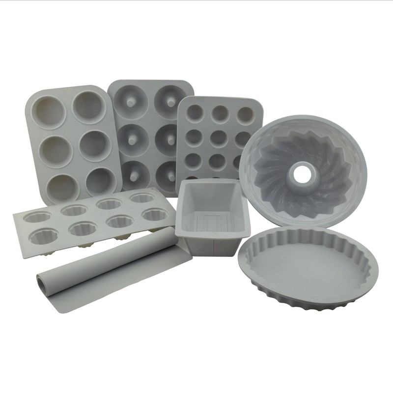 - Set includes (1) 6-Cup Silicone Pan, (1) Silicone Bundform Pan, (1) Silicone Mini Bundform Pan, (1) Silicone Loaf Pan, (1) Silicone Tart Pan, (1) 12-Cup Silicone Mini Muffin Pan, (1) 6- Cavity Silicone Donut Pan, (1) Gray Silicone Mat