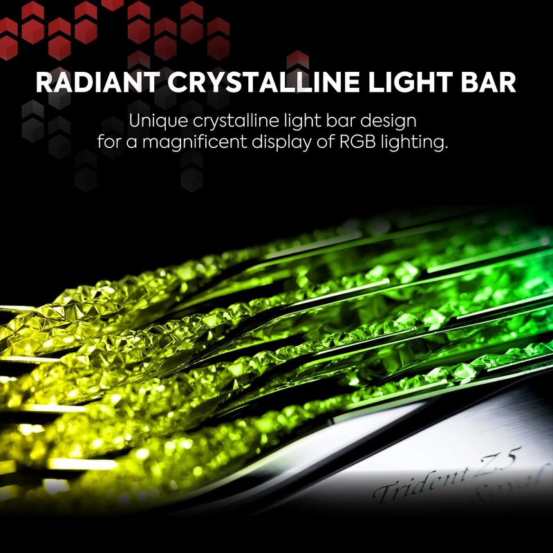 Trident Z5 Royal series are high overclock performance DDR5 memory kits, featuring a patented crystalline-design light bar for a magnificent display of RGB lighting, a CNC-cut aluminum heatspreader with a mirrored finish in gold or silver colors, and supports Intel XMP 3.0 memory overclock profile, designed for high-performance PC enthusiasts and gamers. Flagship overclock performance DDR5 memory designed for gaming and PC enthusiasts Patented crystalline-designed light bar CNC-cut aluminum heatspreaders with mirrored-finish in gold or silver colors Customizable RGB lighting support Intel XMP 3.0 Support