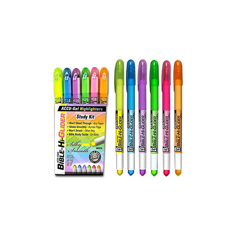 G.T. Luscombe Company, Inc. Accu-Gel Bible-Hi-Glider Bible Study Set | Precise Tip Size | No Bleed Solid Gel Highlighter | No Smearing or Fading | Long Lasting Bright Translucent Colors (Set of 6)