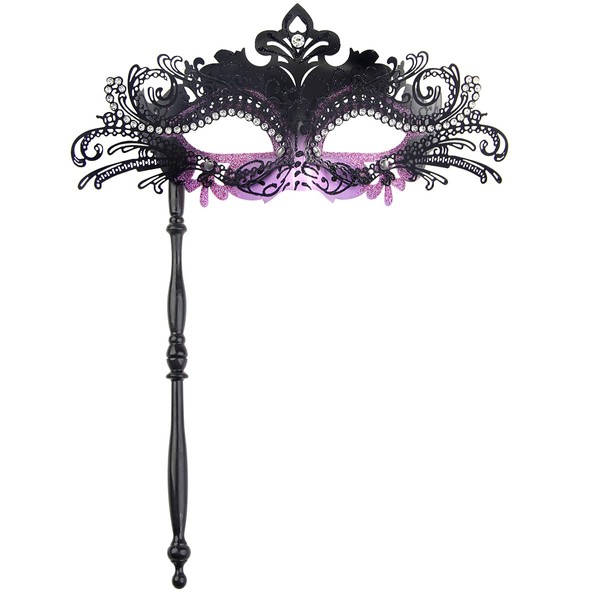 G YITENG Venetian Masquerade Mask with Handle, Black Metal Filigree Design with Rhinestones, Handheld Stick Mask for Mardi Gras, Costume Parties (Black&Light purple)