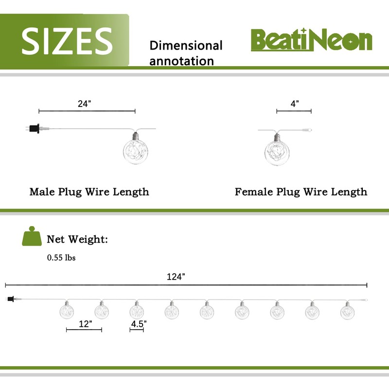 - SIZE & CONNECTIVITY: The lenght of the entire string is 10.3ft. Power cord 2ft, bulbs spacing 12inches (9 bulbs in total), and 4" tail plug. This string light can be connected from end to end up to 2 sets. Makes it long enough for a larger space use.