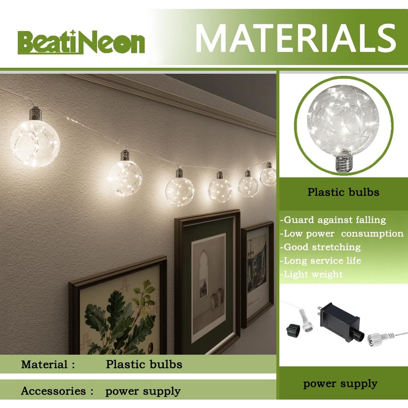 - SAFE AND DURABLE: Constructed from quality materials, each bulb is protected inside a globe shape casing while the entire set is rated for indoor and outdoor use (please keep the power adapter away from water). Bulbs were made with plastic, which makes it shatterproof.