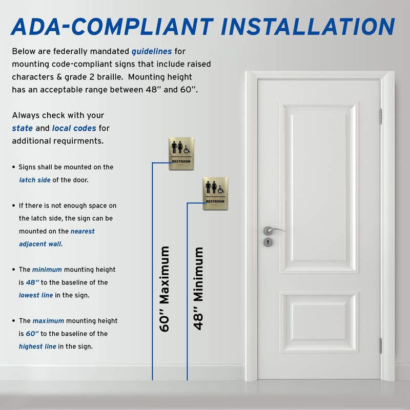 - âś… ADA COMPLAINT & BRAILLE SIGN: Our restroom signs for business are compliant with national ADA and braille reading standards. Where permanent commercial signs are required, a sign should be installed on the wall adjacent to the door handle or latch side of the door. These ADA bathroom signs should be hung 48 to 60 inches between the finish of the floor and the bottom of the last line of copy on the sign.