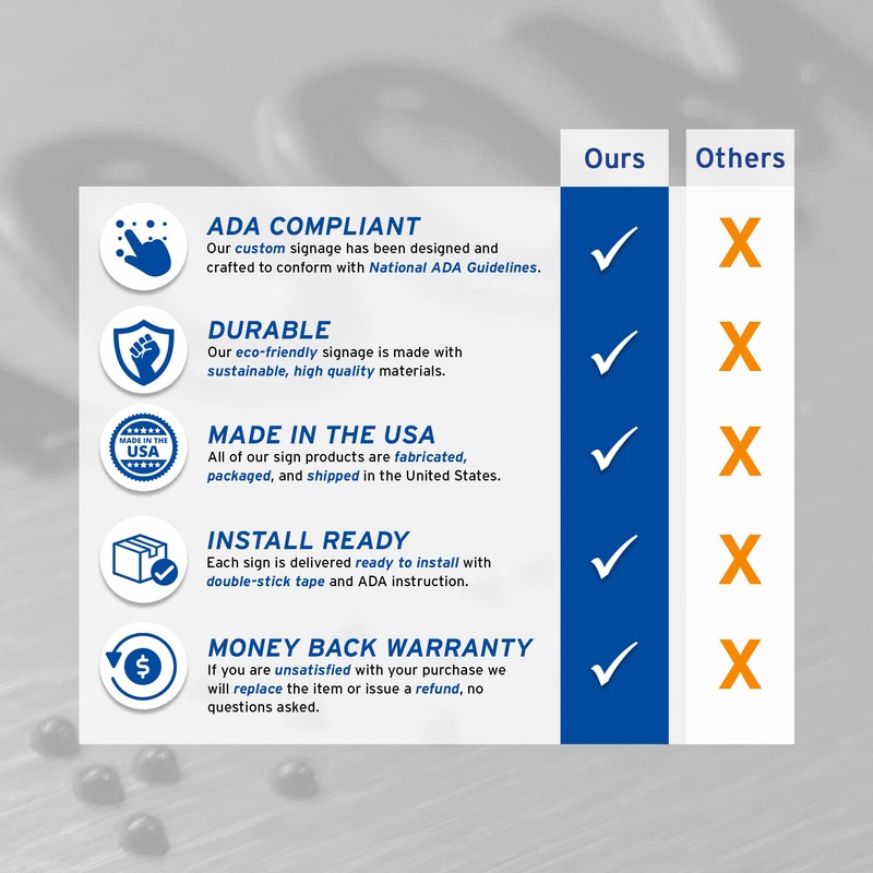- âś… ADA COMPLAINT & BRAILLE SIGN: Our restroom signs for business are compliant with national ADA and braille reading standards. Where permanent commercial signs are required, a sign should be installed on the wall adjacent to the door handle or latch side of the door. These ADA bathroom signs should be hung 48 to 60 inches between the finish of the floor and the bottom of the last line of copy on the sign.