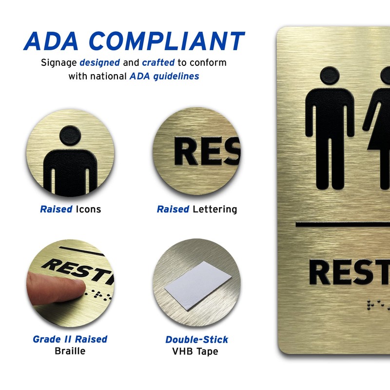 - 💡MODERN RESTROOM SIGNAGE: GDS’ bathroom sign has been designed to abide by national ADA guidelines, including raised icons, raised lettering, and Grade 2 raised braille. Easily label the restrooms in your space to make your customers or guests feel welcomed with this contemporary restroom sign! Ideal for any business, office, restaurant, or another environment where you would like to add some style to your commercial signage.