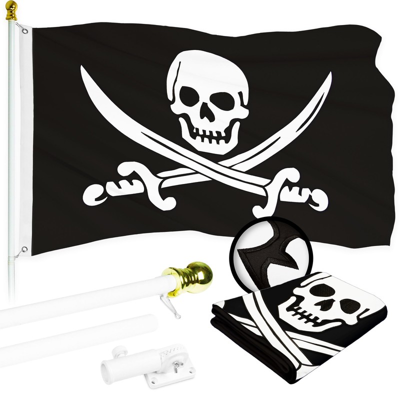 - DELUXE PACKAGE: G128 is including a 2.5x4 Ft, Embroidered, Pirate Jolly Roger Swords flag with brass grommets for this deluxe flag and flagpole package!