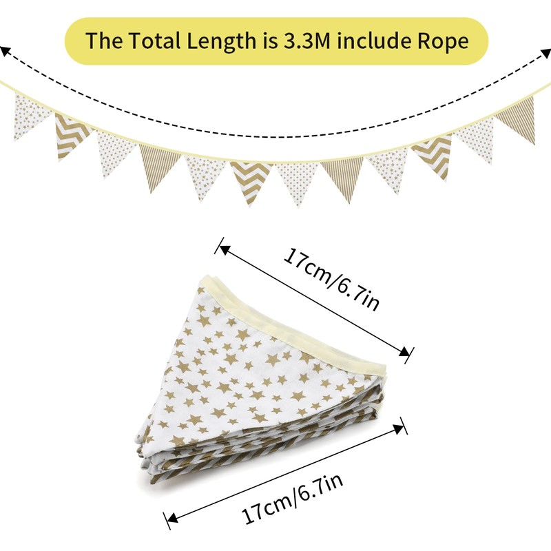 G2PLUS Gold Fabric Bunting Banner, 10.8 Feet Star Strip Cotton Garlands, 12PCS Double Sided Fabric Triangle Pennants for Birthday Wedding Afternoon Tea Garden Party