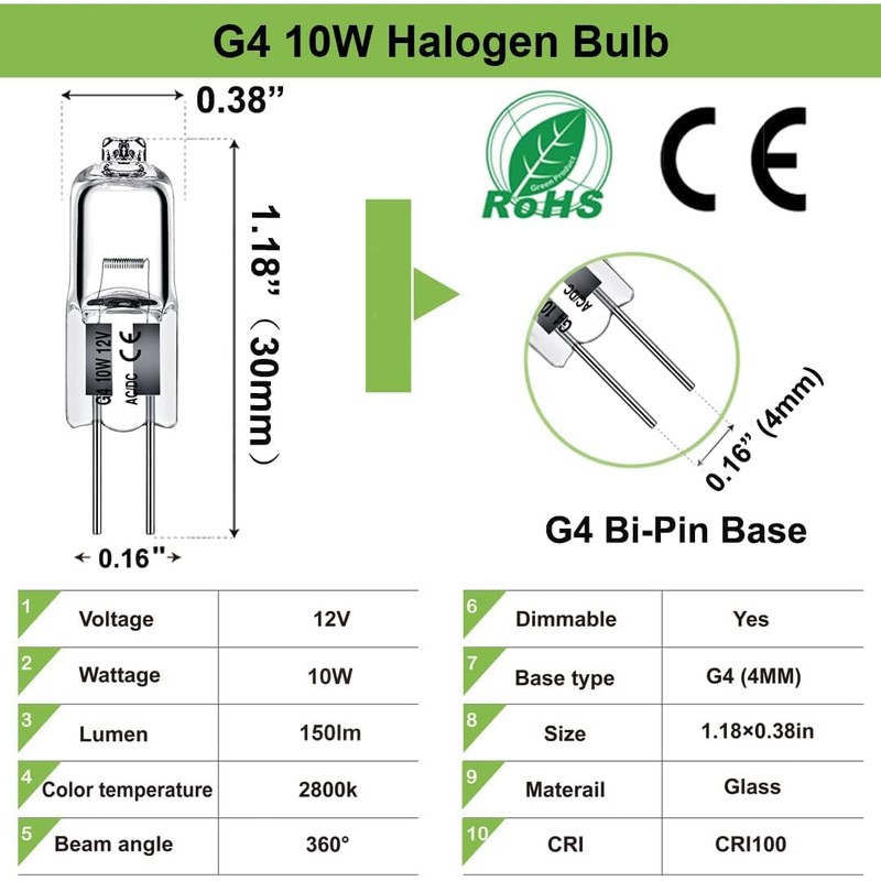 - 3,【G4 Dimmable】: Control the brightness of your g4 halogen 10w with the ability to reduce from 100-10% lighting output. Set your g4 bulb according to your mood and take delight in a pleasant atmosphere every time.