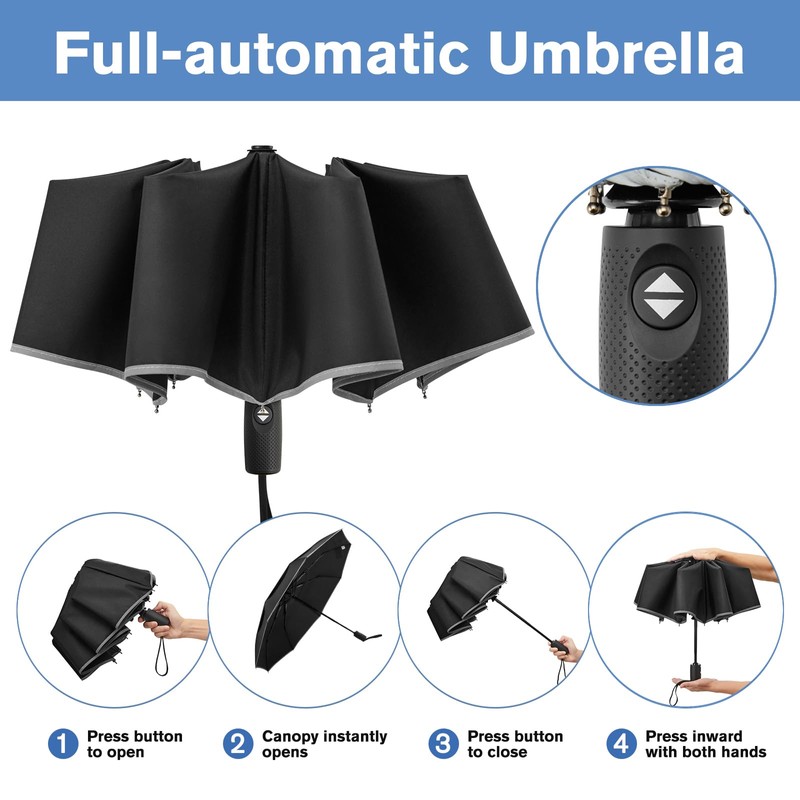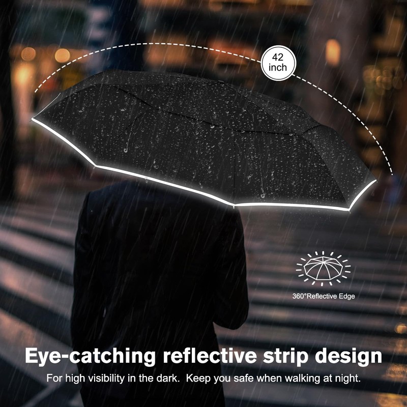 - 【Secure 360° High Visibility Reflective strip】At night or in the darkness of a storm, the 360° high-lighted reflective strip around the edge of the umbrella is easier to see. For you to walk in the rainy night added safety.