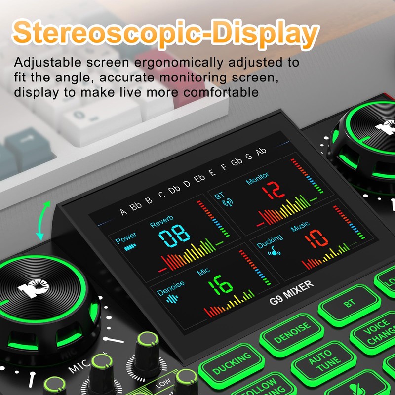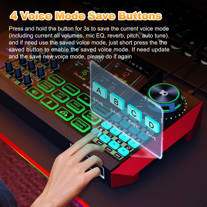 - 【Unique Design For Saving Your Voice Mode】G9 Sound card can save your different voice modes, save your settings about mic EQ, reverb, pitch, autotune, voice changing, ect, up to 4 modes can be saved, great for different sound scenes need. You just need set up, then save, and then switch to it, and you live stream or podcast with it.